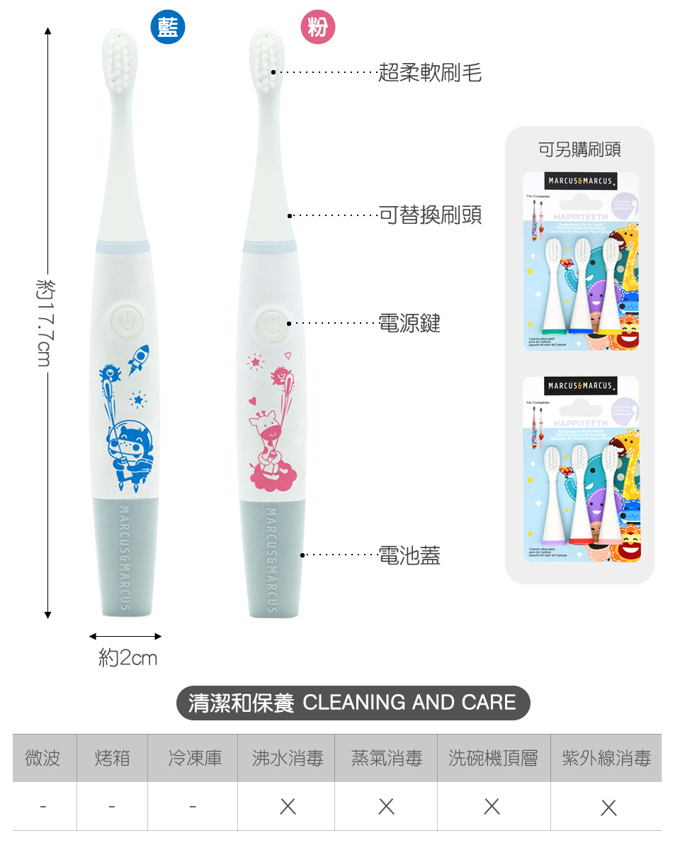 ‧電動牙刷防水,刷頭可更換,握把尺寸適合寶貝的小手。
