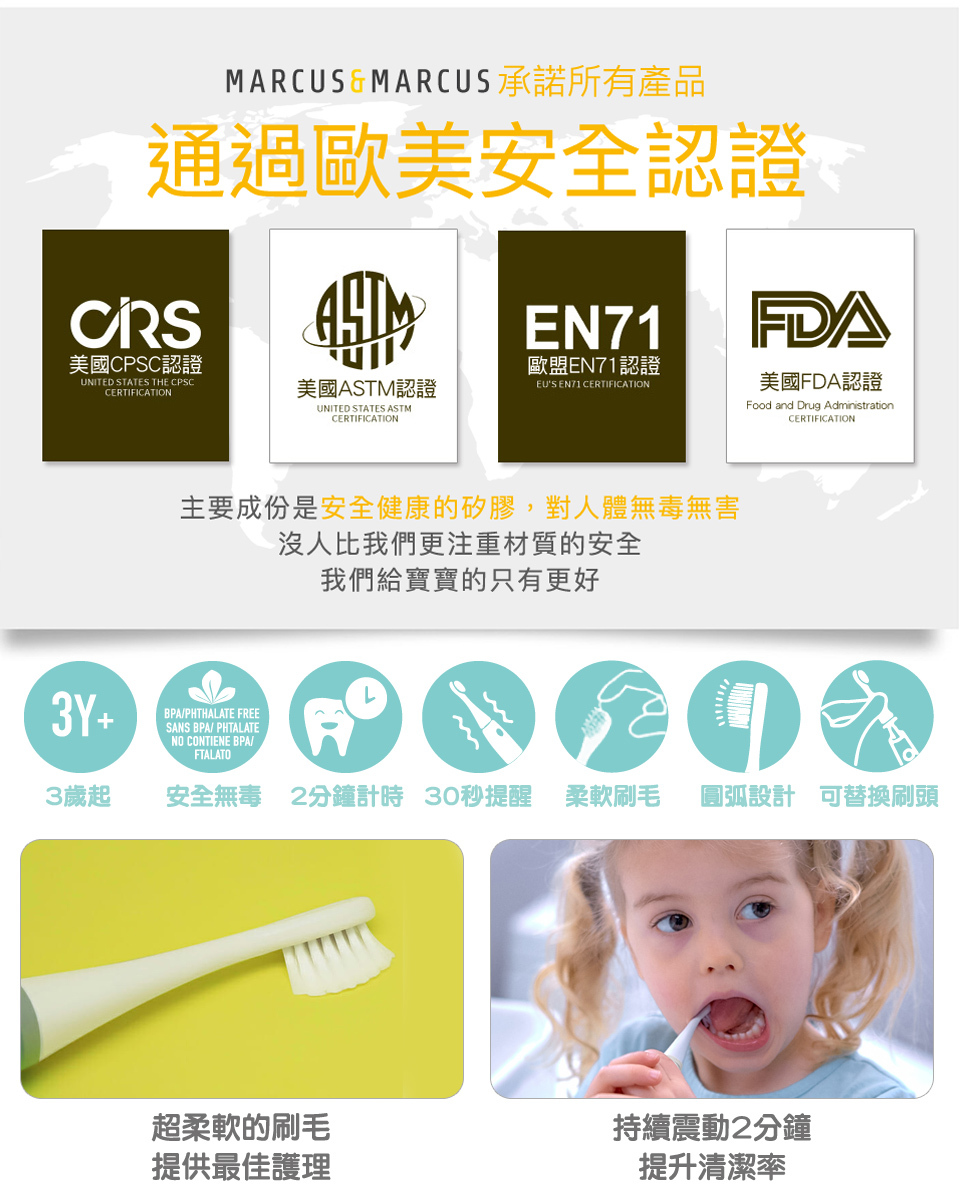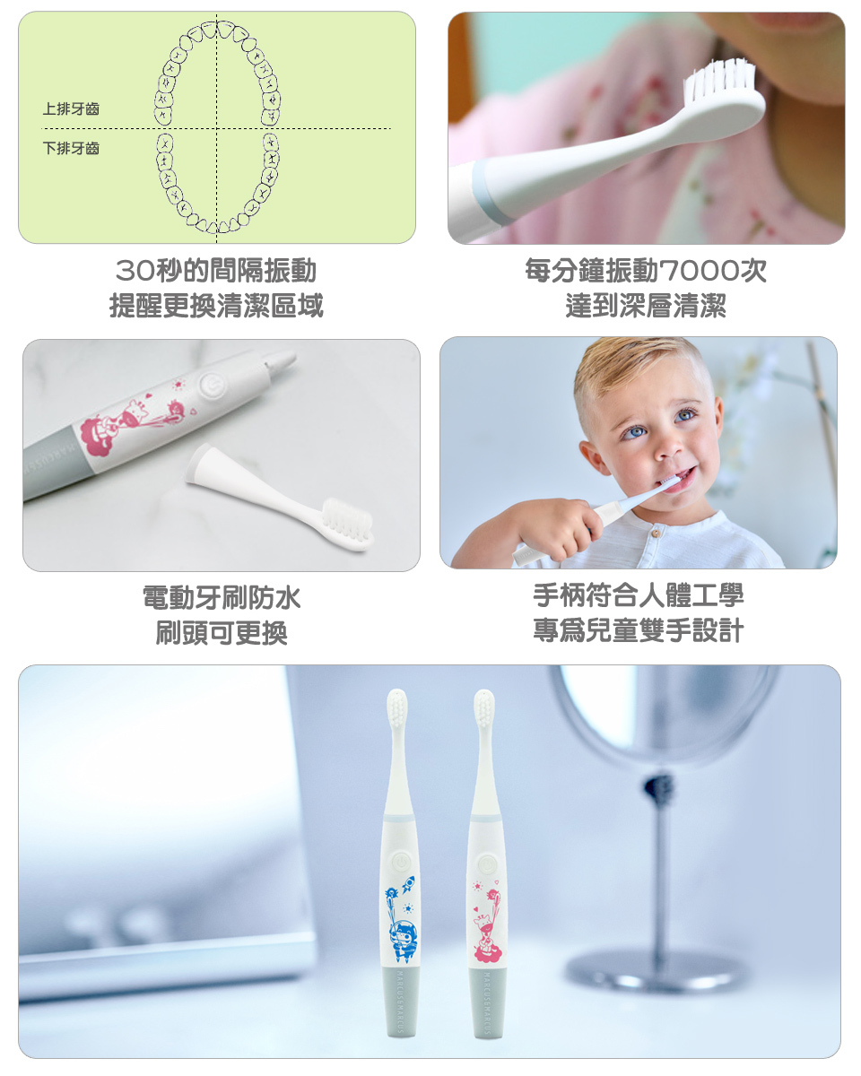 ‧每分鐘振動7000次,達到深層清潔且不會傷害寶貝幼嫩的口腔。
