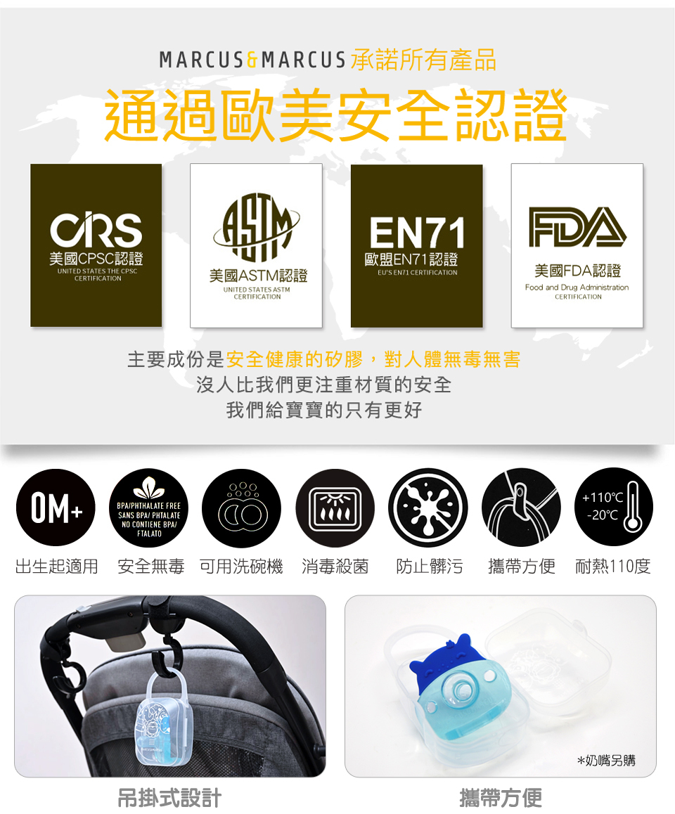 ‧吊掛式設計,可懸掛於嬰兒推車、嬰兒床等,方便取用。
