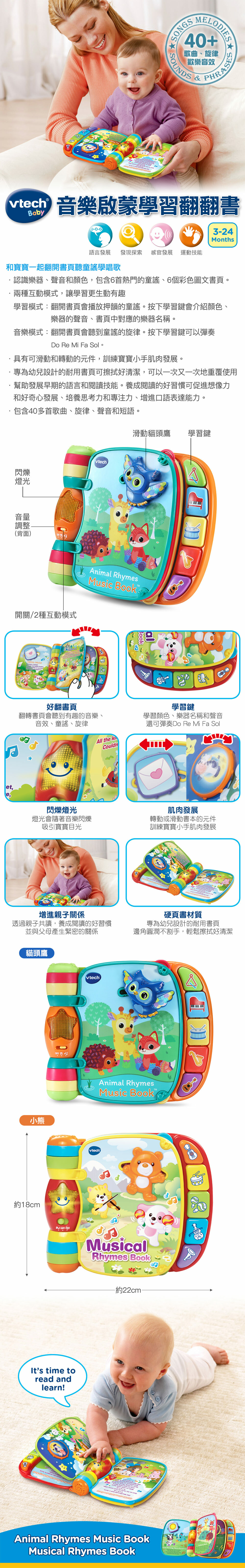 音樂模式:翻開書頁會聽到童謠的旋律。按下學習鍵可以彈奏Do Re Mi Fa Sol。
