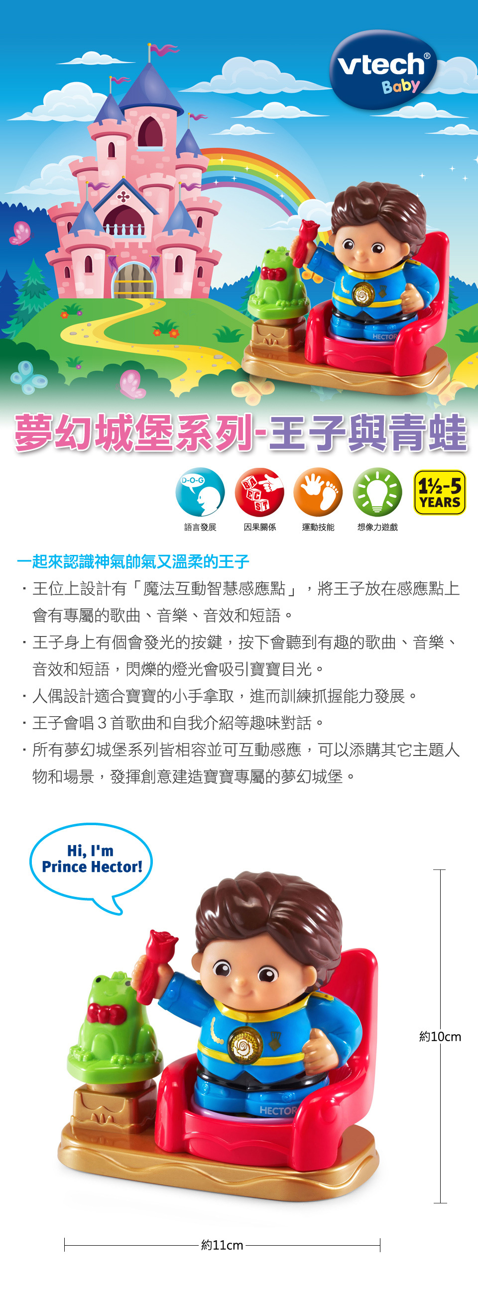 ●王子身上有個會發光的按鍵,按下會聽到有趣的歌曲、音樂、音效和短語,閃爍的燈光會吸引寶寶目光。
